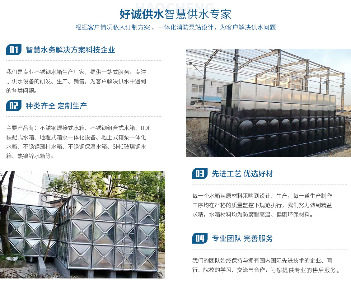 安徽好誠供水設備制造有限公司是一家集設計、研發(fā)、制造、銷售、售后為一體的專業(yè)不銹鋼水箱生產(chǎn)廠家,以科技力量立足于社會。近幾年來致力于供水設備、水箱的研究與開發(fā)。主要產(chǎn)品有:不銹鋼焊接式水箱、不銹鋼組合式水箱、BDF裝配式水箱、地埋式箱泵一體化設備、地上式箱泵一體化水箱、不銹鋼圓柱水箱、不銹鋼保溫水箱、SMC玻璃鋼水箱、熱鍍鋅水箱。對于傳統(tǒng)混凝土水箱的改造(即不銹鋼內(nèi)貼水箱),老舊水箱的拆除、更換、...